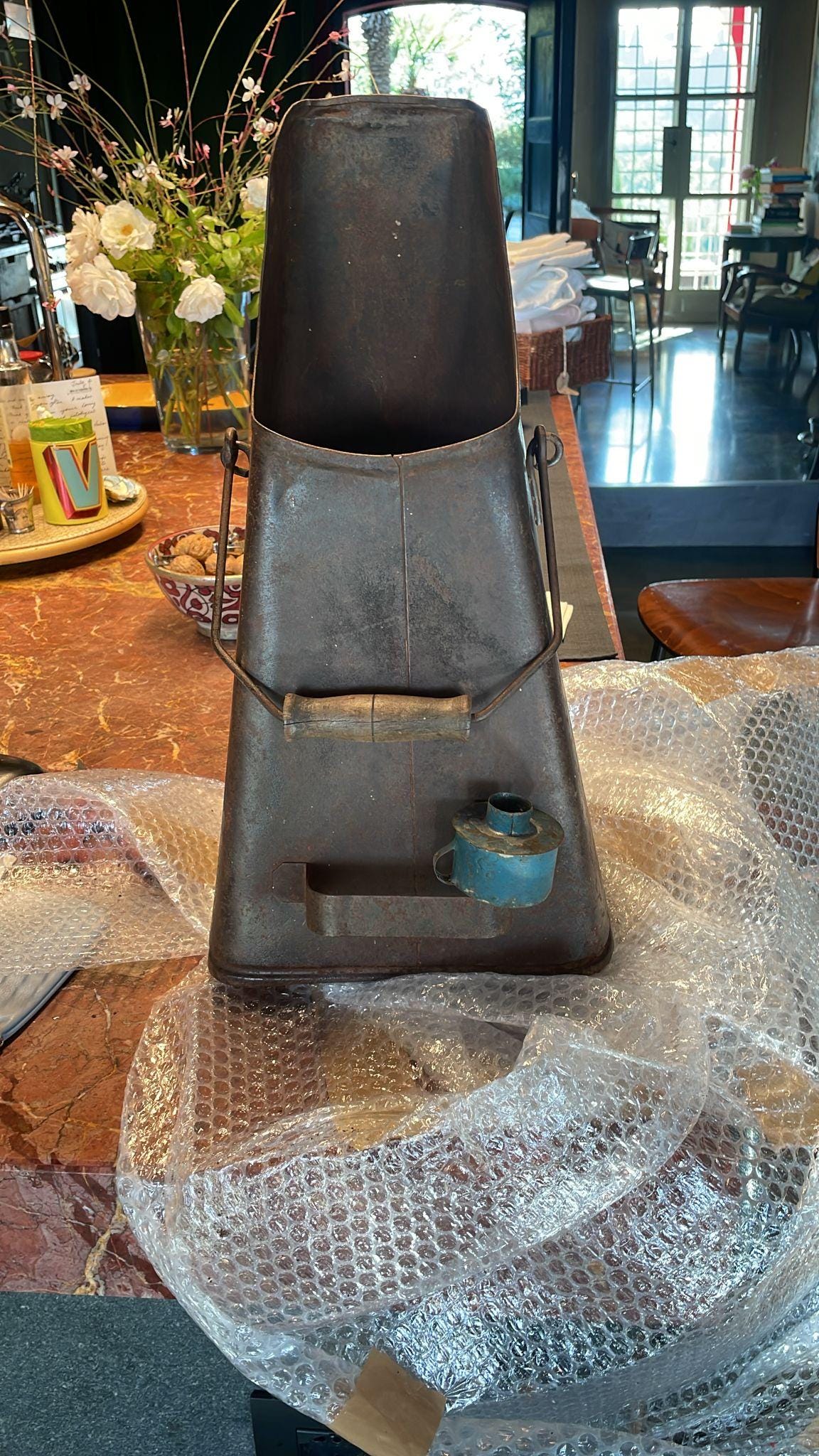It comes with a small tin candle holder which was found with the bucket, probably to light up the basement where the coal was stored.